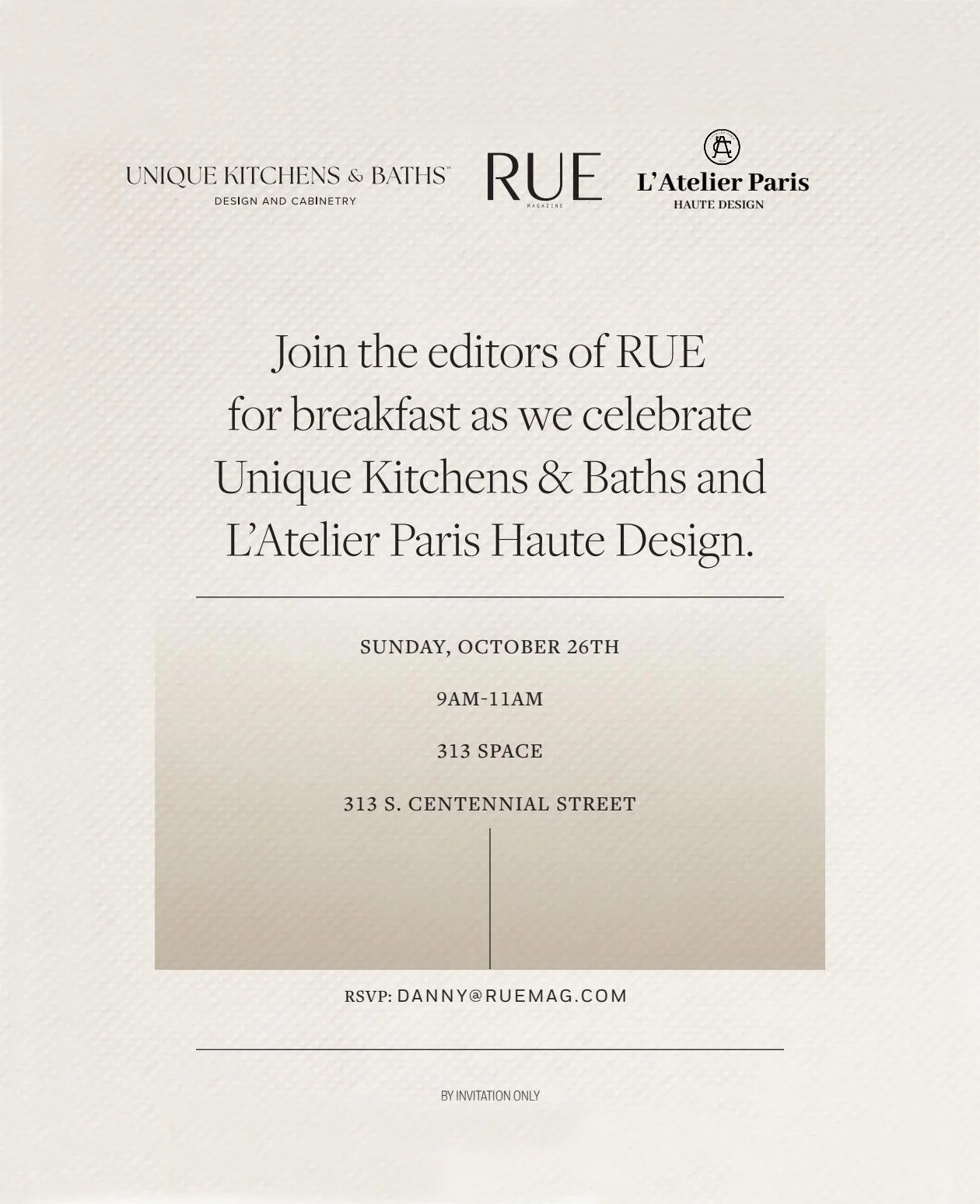 Please join the editors of Rue Magazine for breakfast to celebrate Unique Kitchens & Baths and L’Atelier Paris