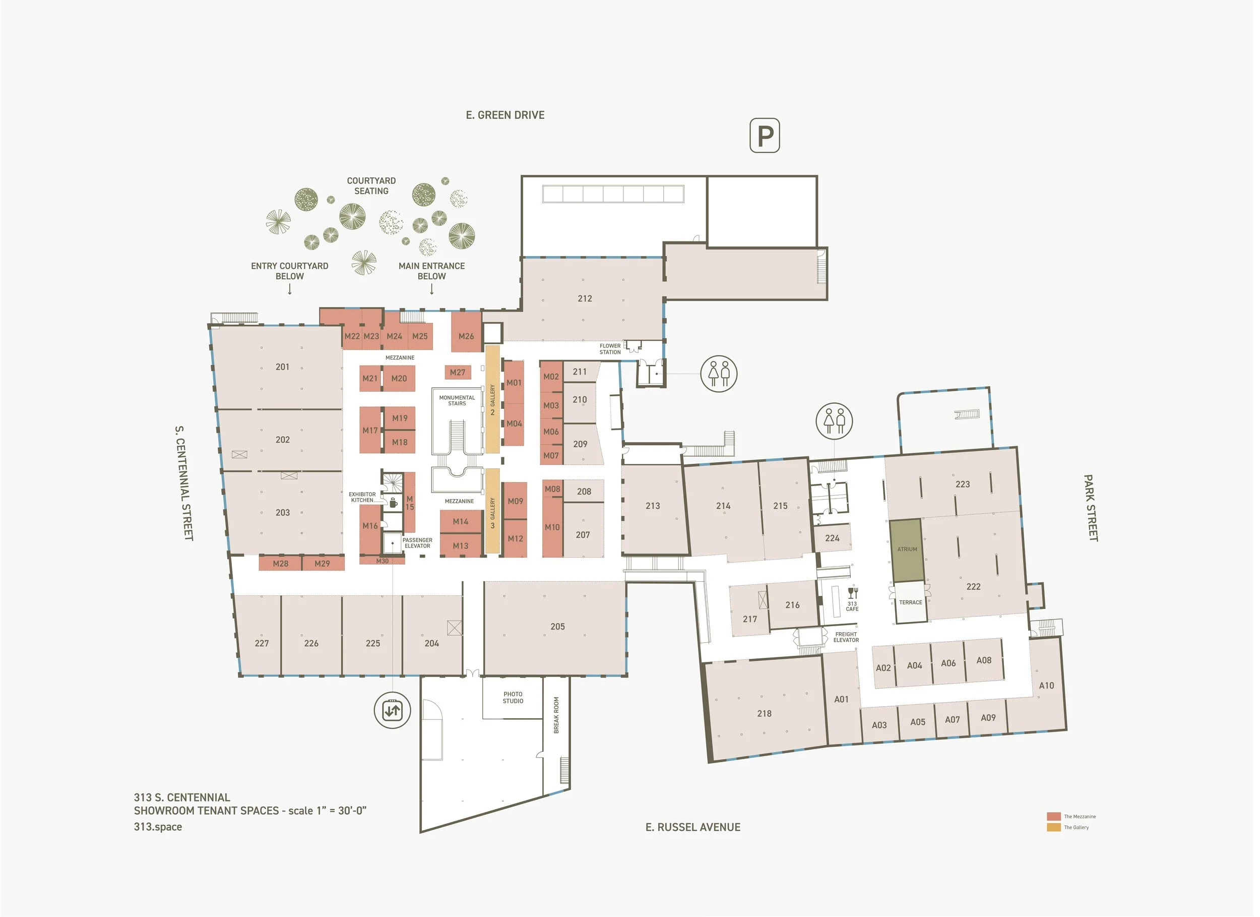 The Mezzanine is inspired by turn of the century, luxury mercantile traditions, with restored European oak, brass and glass cabinetry and tables rescued from a former European department store. Spaces are uniquely configured with these pieces to recreate an authentic experience and display exhibitor’s collections. These spaces start at $25 a sq.ft. ranging in size and are thoughtfully organized along the light flooded central staircase. In support of sustainability, we provide water bottle refill stations through out the floor. All tenants have full access to the restorative courtyard gardens. Become a part of our inspiring creative community, join others with a shared ethos and passion for design at 313.